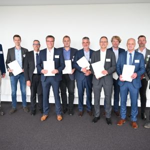 Die Urkunden wurden durch den Landesminister für Umwelt, Naturschutz und Verkehr – Oliver Krischer (ganz rechts) und den Präsident des Bundesamt für Logistik und Mobilität – Christian Hoffmann (ganz links) übergeben.