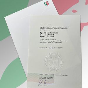 Das Ministerium für Umwelt, Naturschutz und Verkehr des Landes Nordrhein-Westfalen dankt der Spedition Bernhard Messing GmbH für die Unterstützung der Zivilen Notfallvorsorge im Straßenverkehr des Landes Nordrhein-Westfalen.