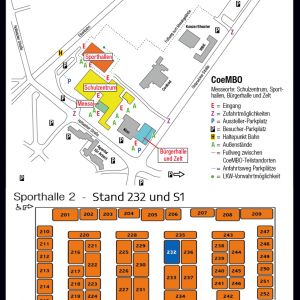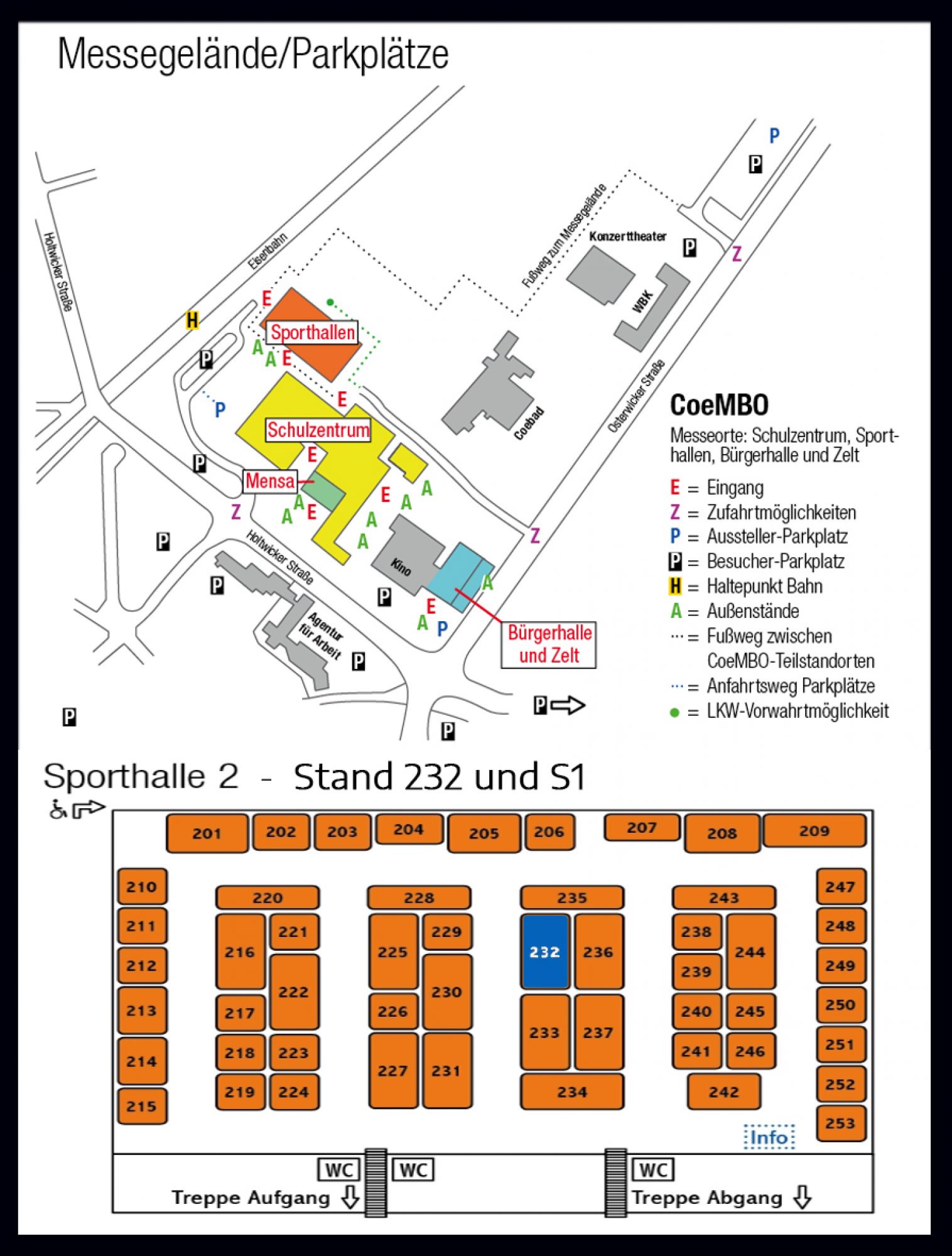 (Sporthalle 2 – Stand 232) und außen einen LKW auf der CoeMBO.